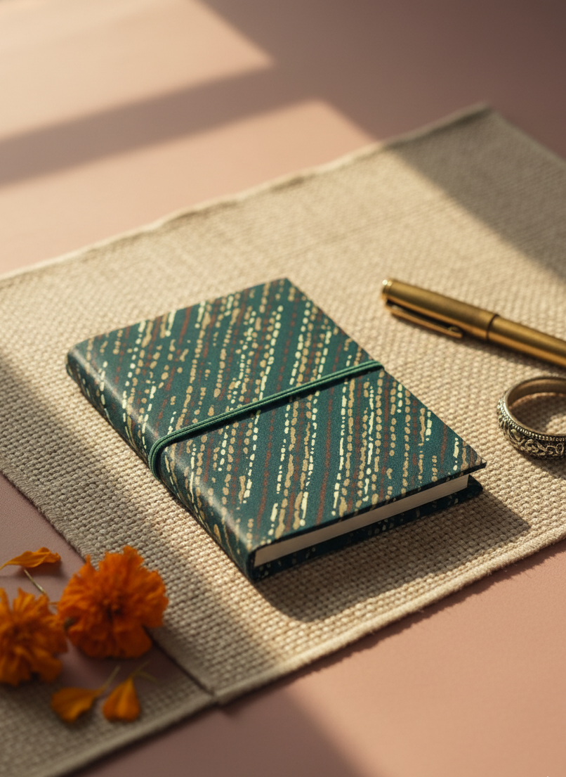 The Nisha journal is inspired by the quiet beauty of the night - calm, deep and endlessly reflective. Handcrafted in Rajasthan, it offers a tranquil space to capture late-night thoughts, dreams, and ideas. Elegant and timeless, Nisha turns every page into a moment of stillness and introspection.
